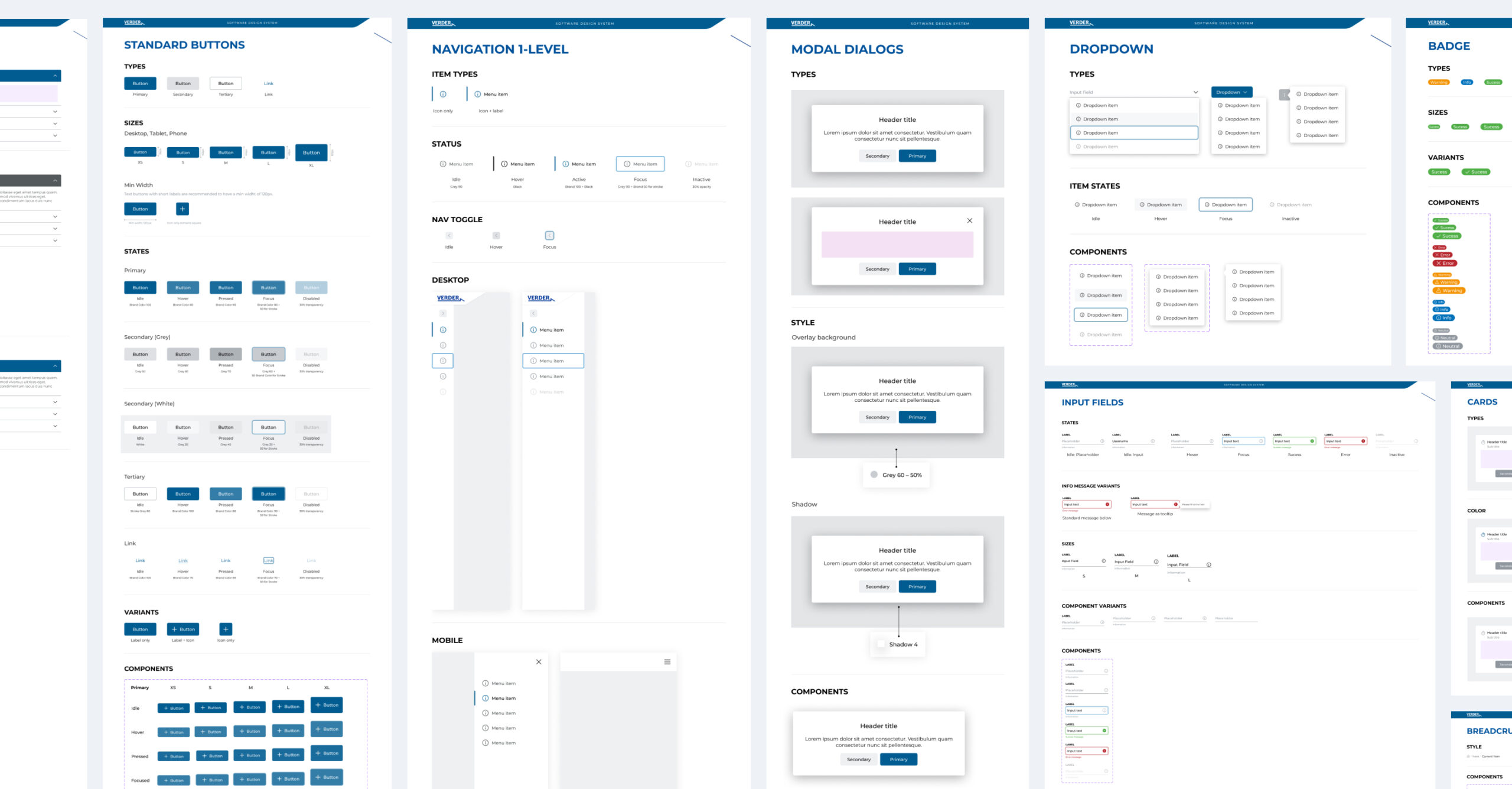 Documentation of components with types, size, states, and variants.